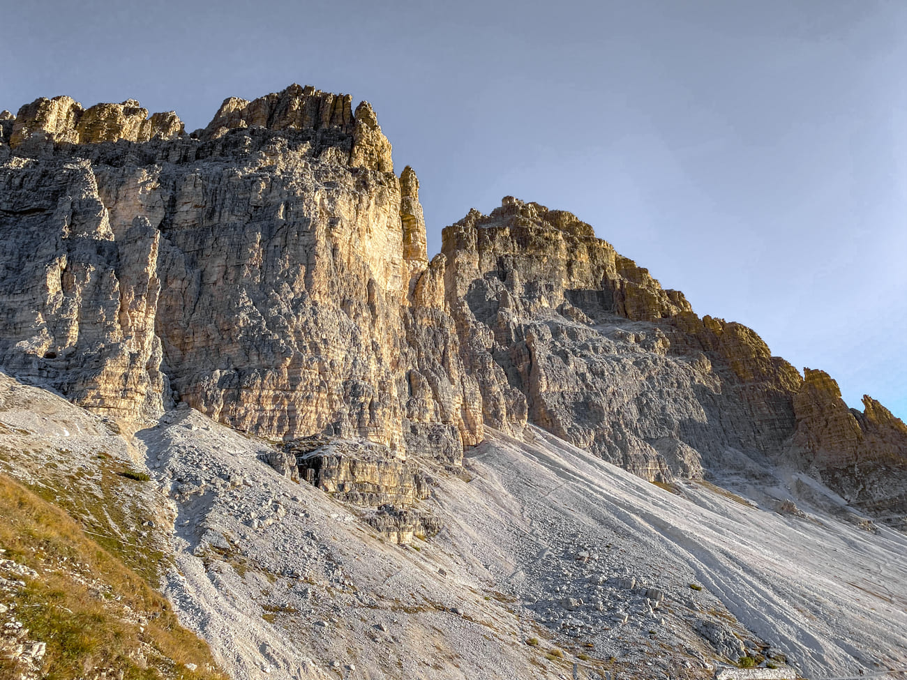 Wir treffen uns um 6:00 Uhr bei der Eni Tankstelle in Toblach. Nach einem Kaffee und einen kurzen Materialcheck fahren gemeinsam über die Drei Zinnen Straße auf die Auronzohütte. Hier startet unser Abenteuer. Eine halbe Stunde spazieren wir gemütlich zum Einstieg hoch. Hier legen wir unseren Gurt und Helm an. Eine breite Rampe mit einigen Kletterpassagen führt uns mitten ins Herz der großen Zinne. Mit der Sonne im Rücken kommen wir nun bald ins Amphitheater, wo die Schlüsselstelle unserer Tour wartet, ein etwas polierter Kamin.